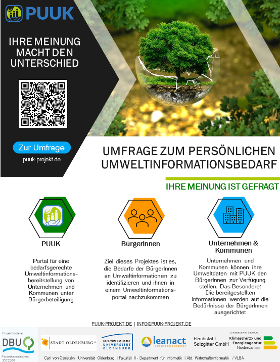 Besonders zu erwähnen ist, dass die Bürgerbeteiligung dem Projekt PUUK eine besondere Rolle zugespielt wird. Mit der Hilfe von Onlineumfragen, Experteninterviews und Workshops sollen die Bedarfe der BürgerInnen an Umweltinformationsportalen identifiziert werden, die bei einer prototypischen Entwicklung einer neuartigen Umweltinformationsplattform umgesetzt werden.