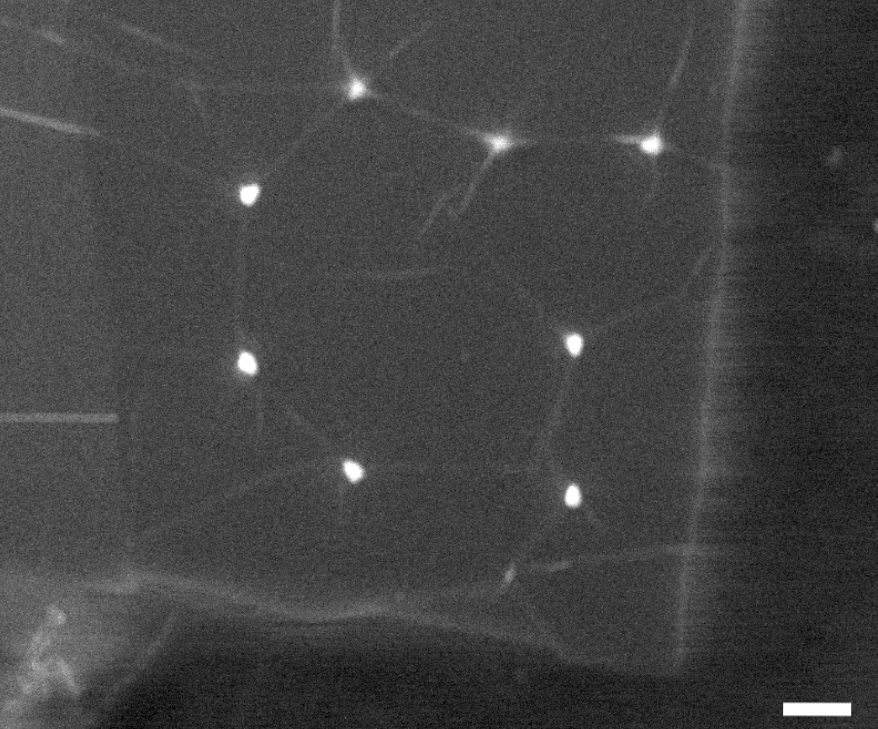 Rasterelektronenmikroskopaufnahme von deterministisch erzeugten Falten in einer WSe₂-Monoschicht-Nanoschicht, die linear polarisierte Einzelphotonenquellen beherbergen. Der Maßstab beträgt 1 µm.