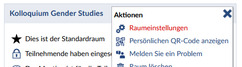 - Dafür bei Meetings auf die 3 Punkte des Raumes klicken, der via Einladungslink zugänglich geschaltet werden soll. Dann auf den ersten Punkt: Raumeinstellungen (hier rot hinterlegt)