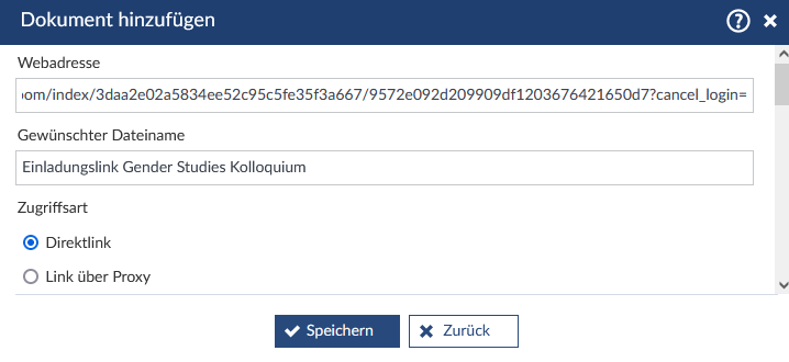 Damit alle Studierende selbstständig auf den Einladungslink zugreifen können, kann er unter Dateien als Webadresse eingespeichert werden.